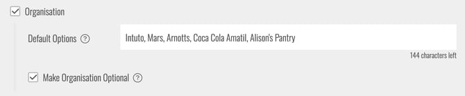 - Organisation - Users will need to fill in the Organisation field. This is a free text field, however you can also add default options to appear in a dropdown box for users to select from. To add default options, type them into the box separated by a comma.