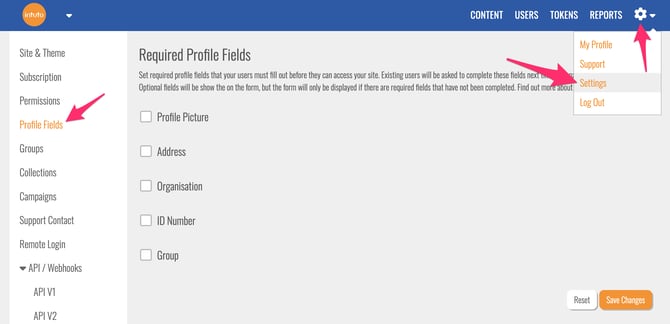 To access the Required Profile Fields page click the cog icon in the top right of your screen and select Settings, then select Profile fields in the list on the left.